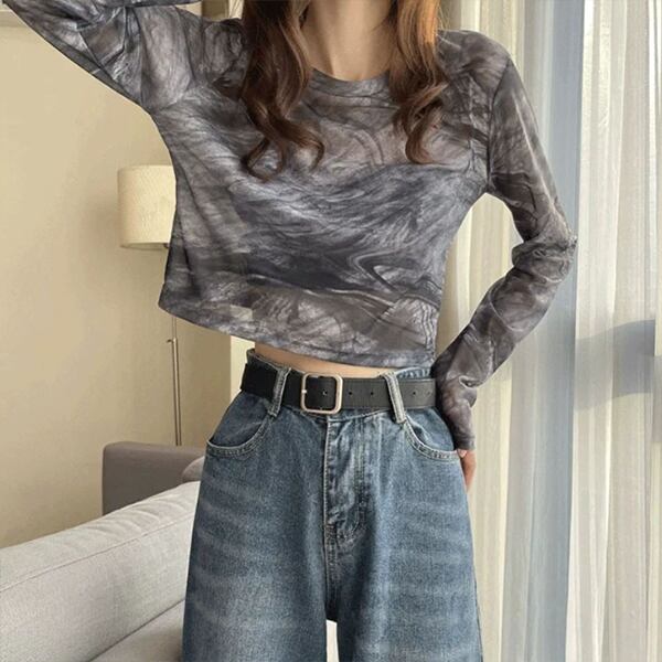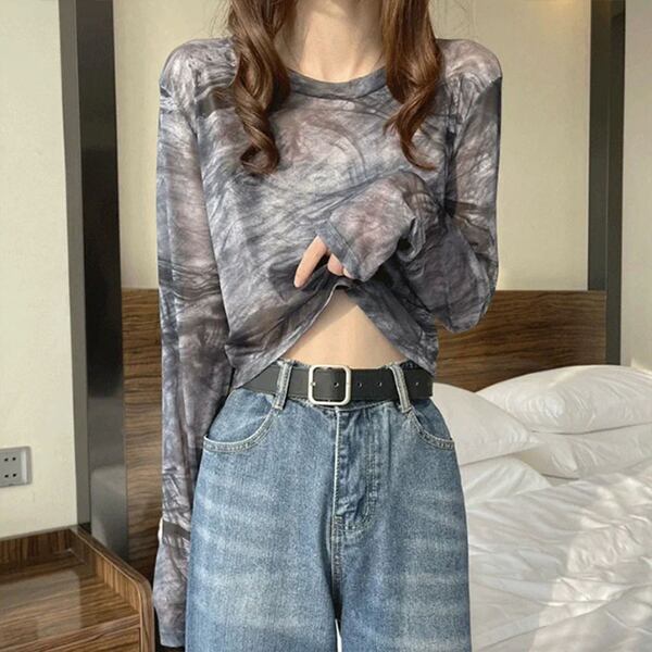 シアートップス 透け感 タイダイ柄 長袖 薄手 クロップド