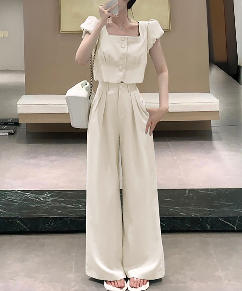 半袖のスクエアネックトップスとタック入りのロングパンツがセットになった、おしゃれな上下2点セットアップ