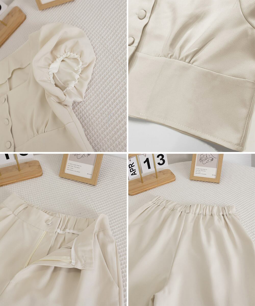 トップスはパフ袖とクロップド丈のデザインで、女性らしいシルエットを演出