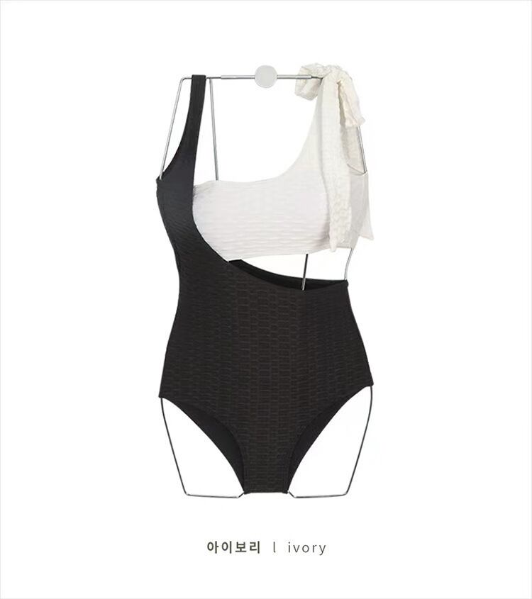 ワンピース水着 ホワイト ブラック M L XL リボン 人気 韓国 体型カバー 可愛い 大人 セクシー 白 黒