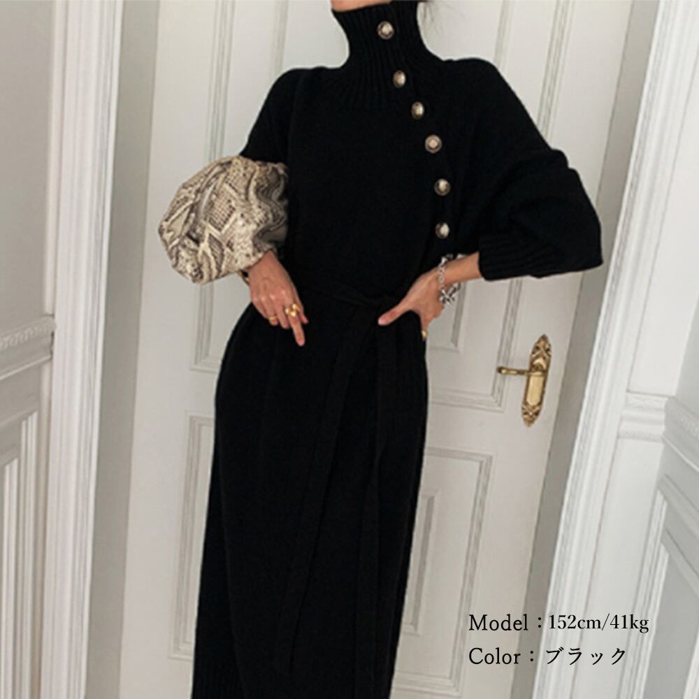 ロングワンピース ウエストマーク おしゃれ タートルネック ミモレワンピ 着やせ 体型カバー 大人かわいい