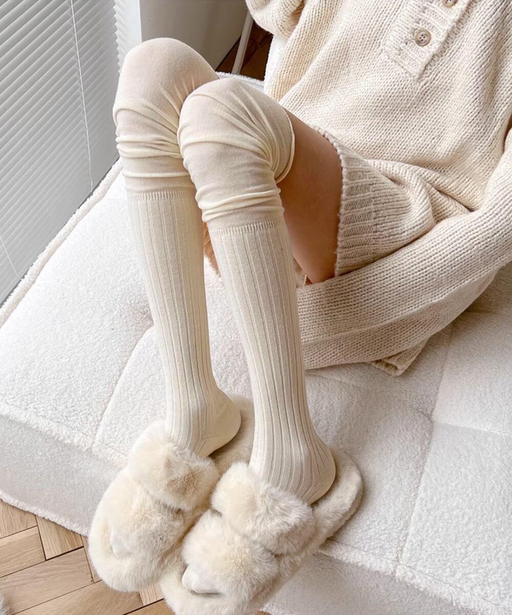 膝下はレッグラインに沿って膝上はルーズ感を表現、フィット感が高くて窮屈感がない切り替えオーバーニーソックス