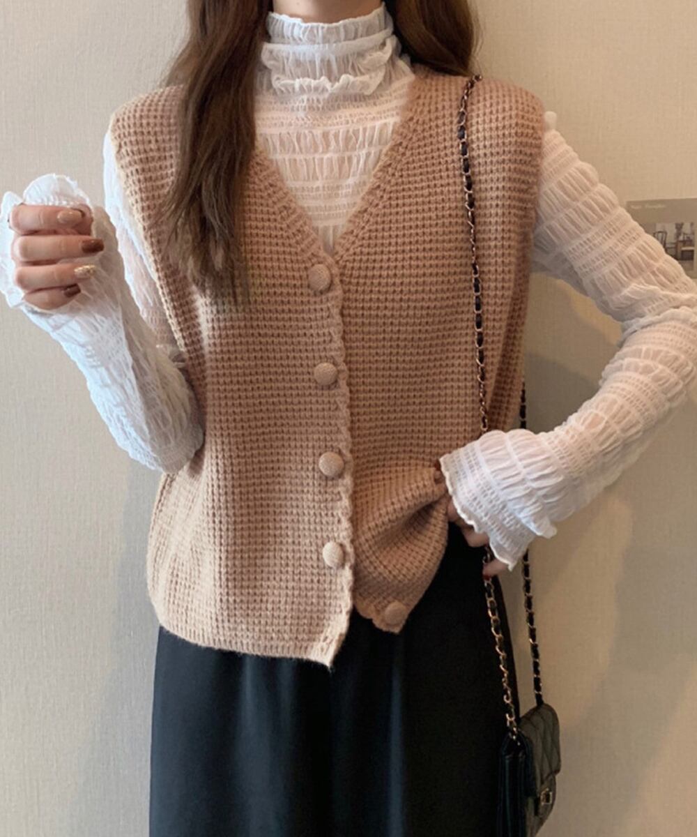 ニットトップス 前開き 韓国ファッション ボタン付き 重ね着 コーディネート かわいい カジュアル レイヤード 洋服