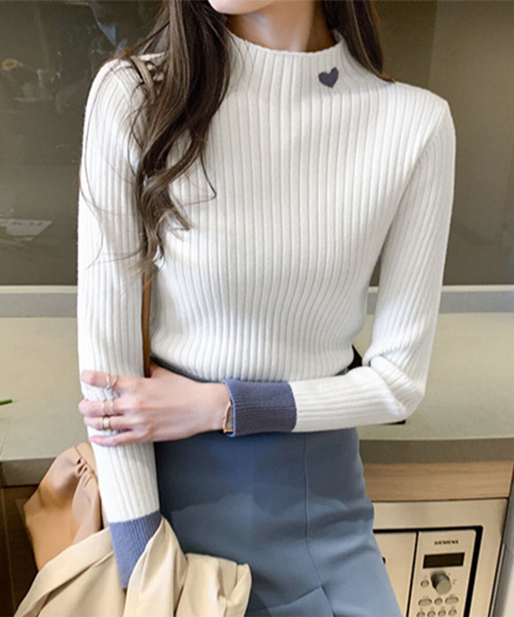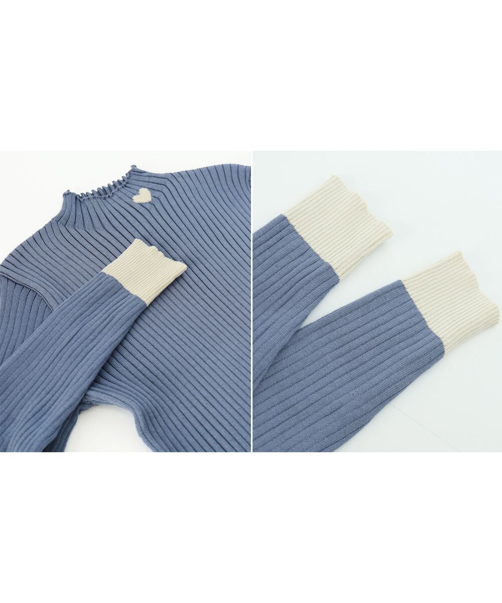 レディース ニットソー リブニット ハート刺しゅう 大人カジュアル 着やせ 韓国風 着回し