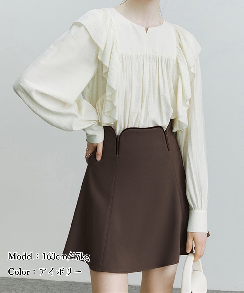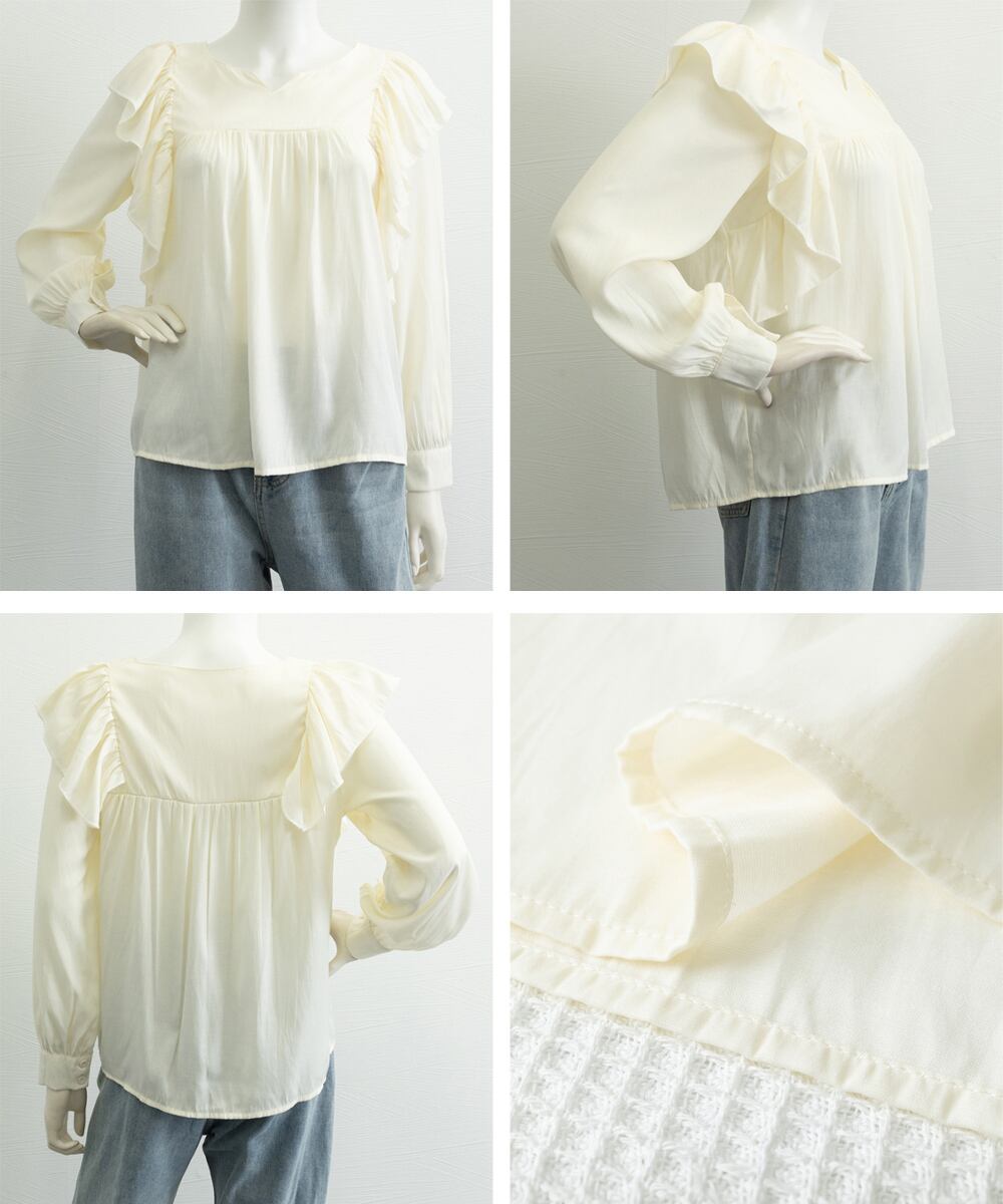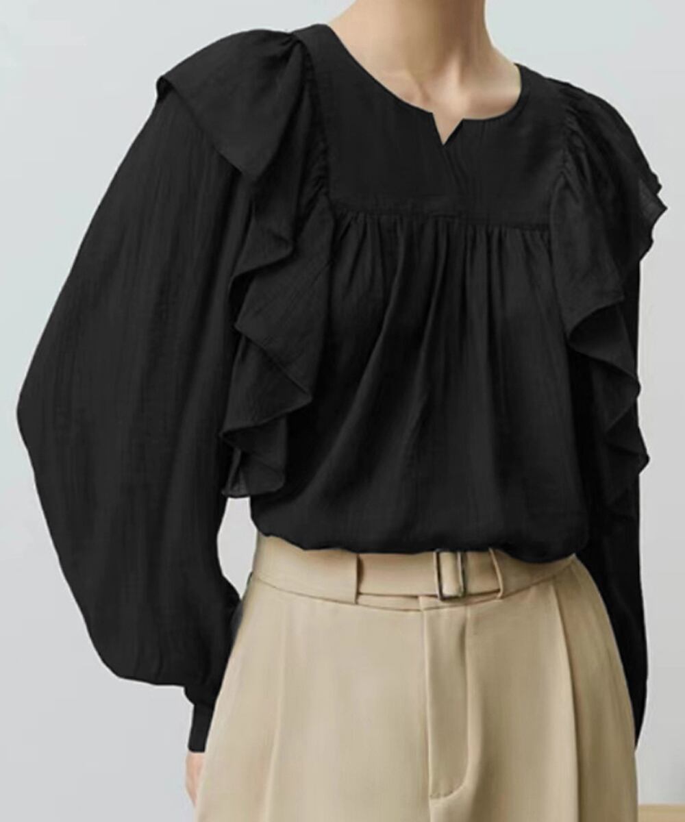 肩から胸元にかけて大きめのラッフルフリルデザインが目を惹く主役級のブラウス