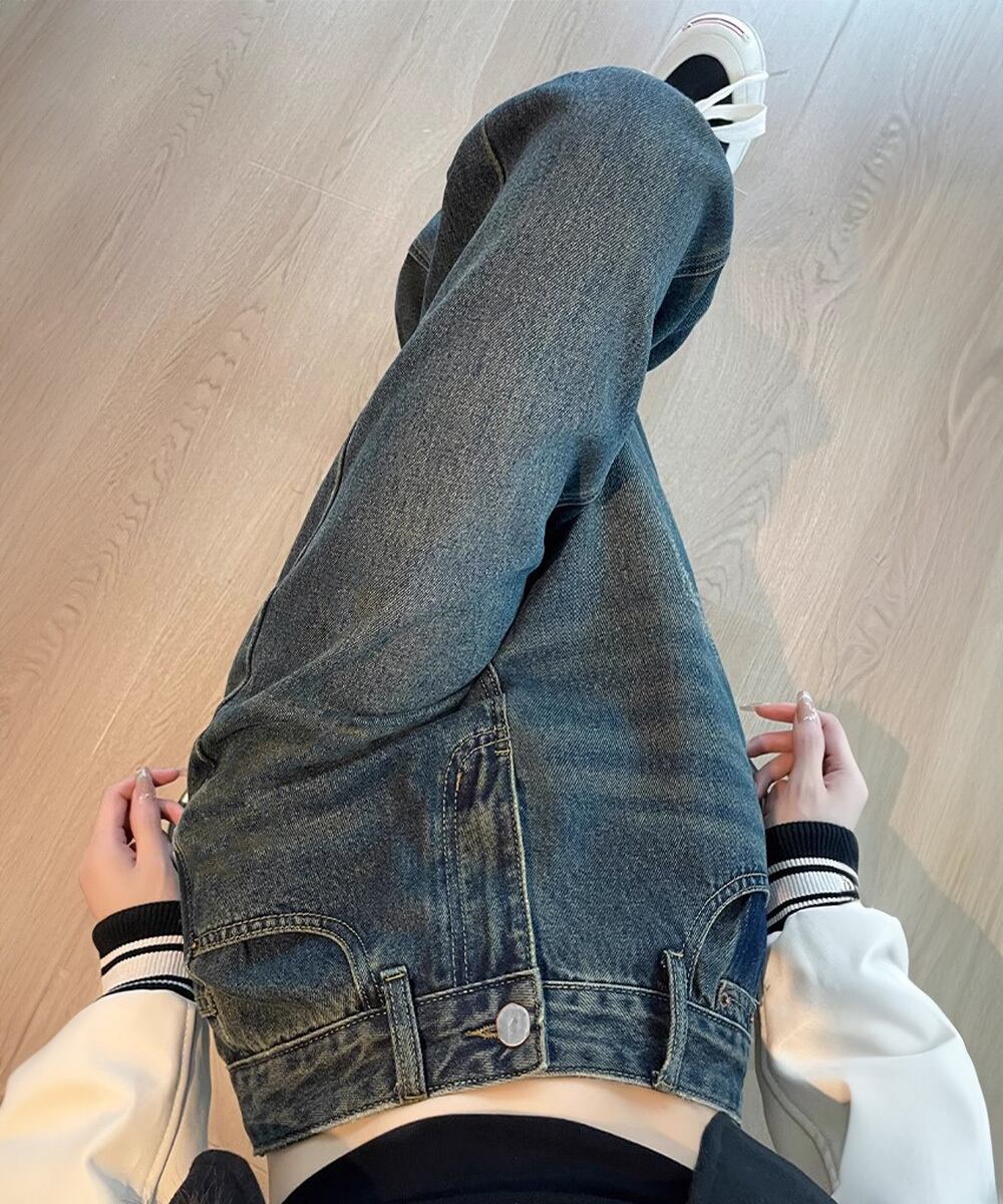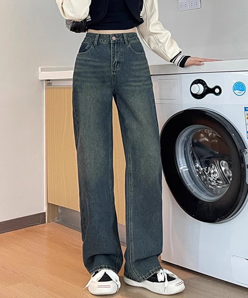 レトロ風ジーンズ ハイウエスト ウォッシュデニム 美脚脚長 セミワイドパンツ フルレングス 着やせジーパン 体型カバー