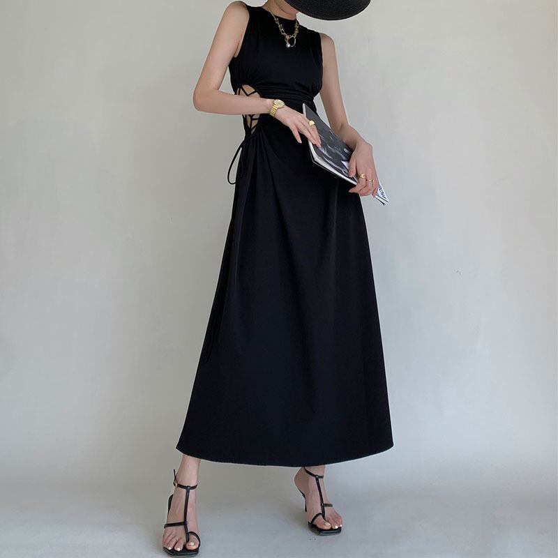 気質 透かし彫りスリット ノースリーブ ラウンドネック キャミソールワンピース