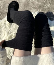 ひざまでしっかりしたリブ生地の上に、ふわふわ柔らかな素材が切り替わってて、暖かくてリラックスできる履き心地。