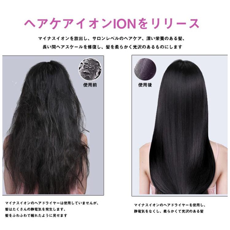高濃度マイナスイオンドライヤーは、空気中の水分を髪の毛に吸着しやすいマイナスイオンに変換して風と一緒に送り出すドライヤーです。 マイナスイオンが髪に潤いを与えて、髪の毛とキューティクルをやさしくケア。美容師の乾かす技術を誰でも再現できるヘアドライヤーです。"