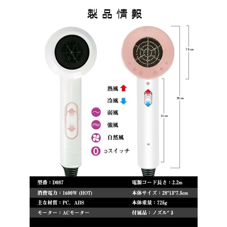 素敵なデザイン ヘアドライヤー マイナスイオン 大風量 小型風筒 速乾 熱風 冷風 携帯 便利 床屋専用