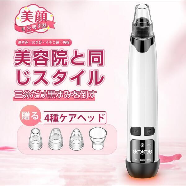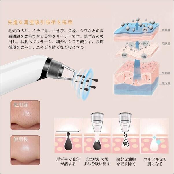 【3段階の吸引力・4種類の吸引ヘッド】燥肌、普通肌、脂性肌の3種類タイプには、弱中強の3段階の吸引力をお選んできます。初めにご使用の時に、弱(L)モードを選択下さい。慣れてきたら、お肌のタイプに合わせた吸引モードをご使用ください。4種類の吸引ヘッド付き、肌の状態や使う目的により選ぶことができます。ヘッドの吸引口のサイズを変えることより、様々な毛穴ケアのニーズに良い応じます。